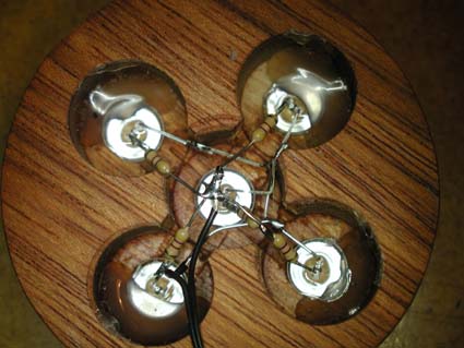 Jag borrade 16 hål i en trälist och kopplade ihop lysdioderna med lite motstånd